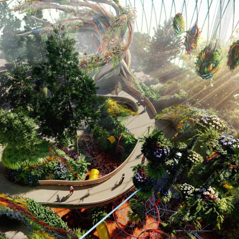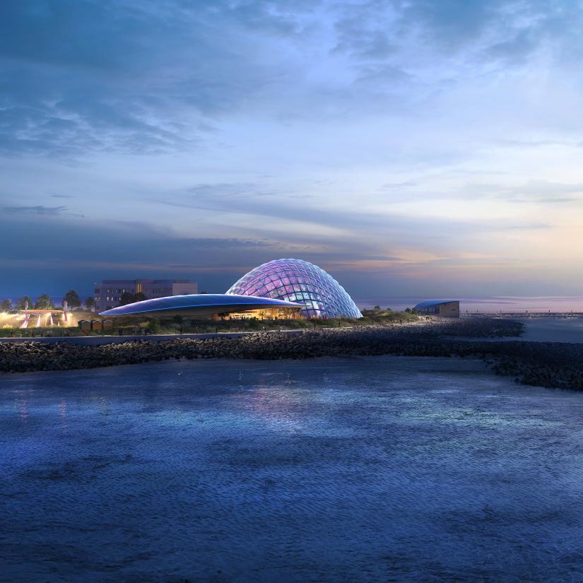 - Three large, shell shaped pavilions containing themed environments such as immersive theatre spaces and a natural observatory.